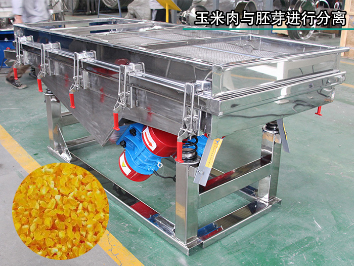 玉米淀粉的提取主要是從,玉米肉中提取的。而胚芽只是玉米粒中的種子部分沒有提取的必要,所以要把玉米肉于胚芽進(jìn)行分離。這里又要用到振動(dòng)篩分機(jī)了。由于這個(gè)環(huán)節(jié)的玉米是經(jīng)過浸泡的其可以使用不銹鋼直線篩分機(jī)了,因?yàn)檫@個(gè)環(huán)節(jié)的玉米以及不是完整的了,其需要注意衛(wèi)生所以小編選用了:不銹鋼的直線振動(dòng)篩。